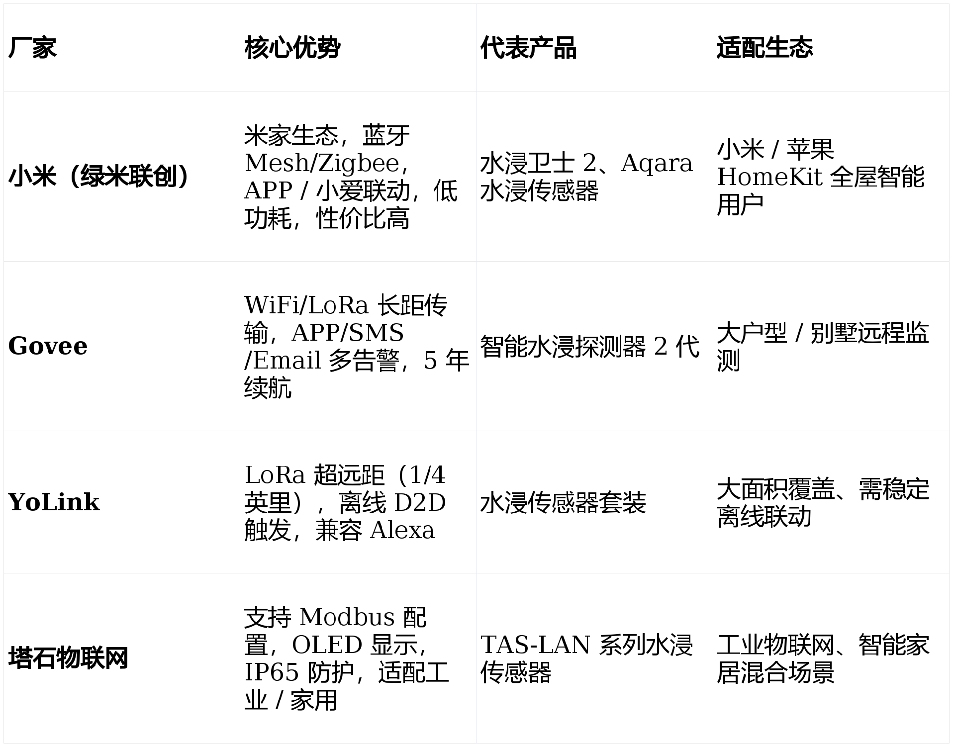 家用場(chǎng)景:小米 / Aqara(生態(tài)聯(lián)動(dòng))、Govee/YoLink(遠(yuǎn)程告警),看無(wú)線協(xié)議(WiFi/Zigbee/LoRa)、續(xù)航能力。